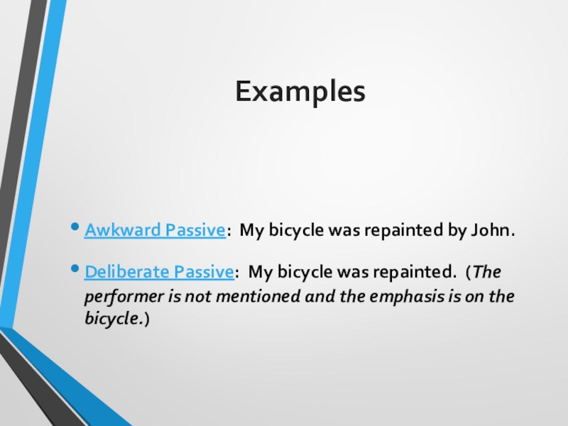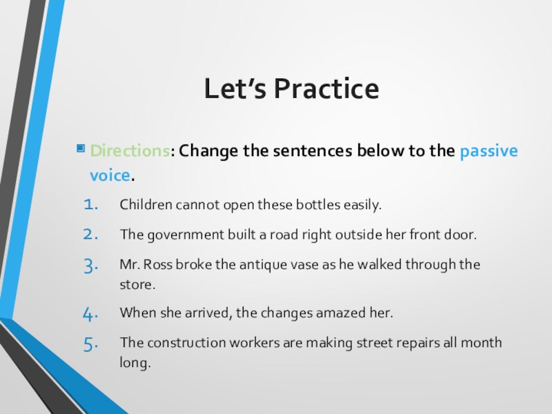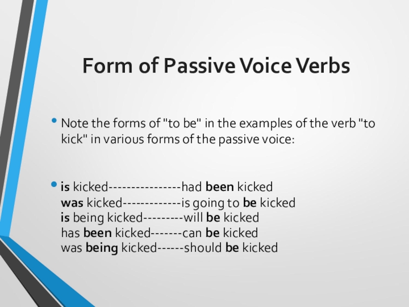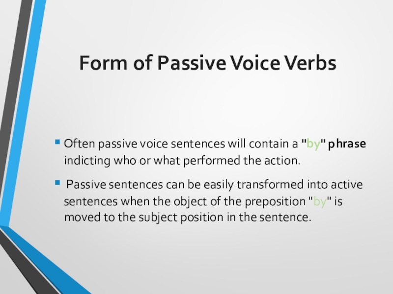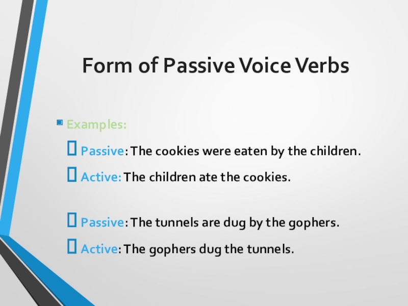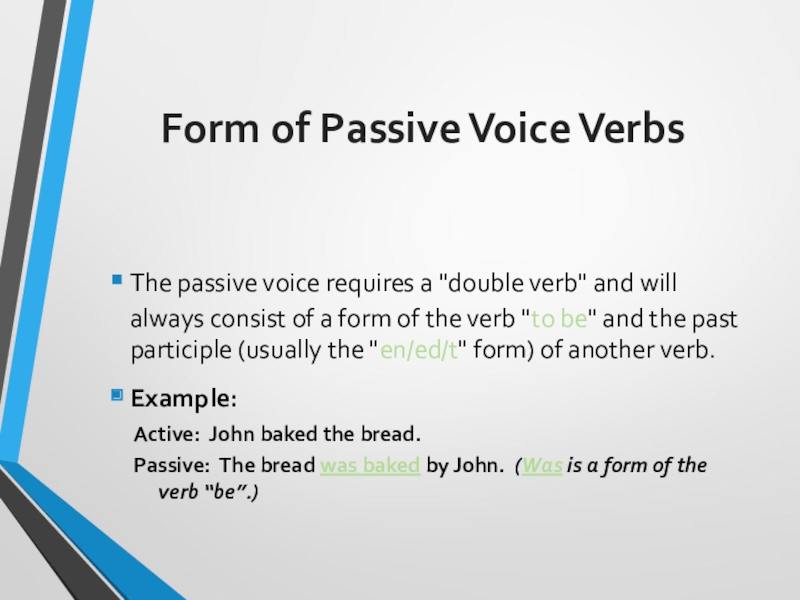 Passive: The bread was baked by John. (Was is a form of the verb “be”.)