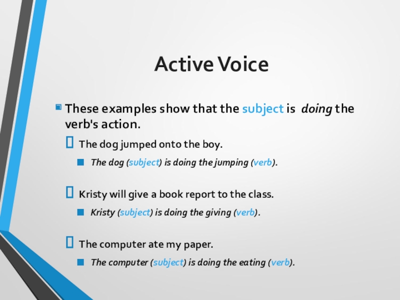 Because the subject does or "acts upon" the verb in such sentences, the sentences are said to be in the active voice.