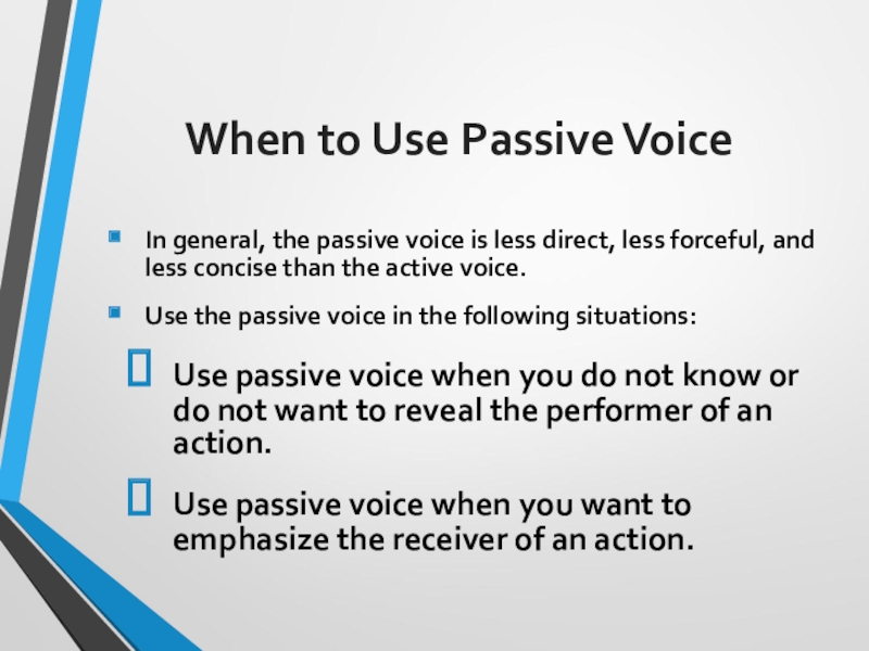 Use passive voice when you do not know or do not want to reveal the performer of an action.