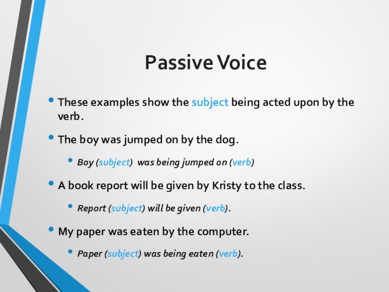Because the subject is being "acted upon" (or is passive), such sentences are said to be in the passive voice.