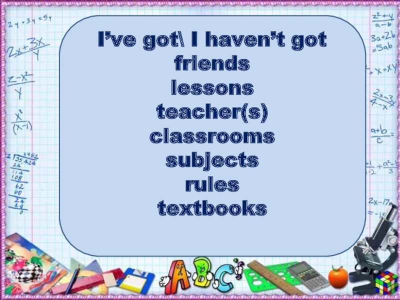 I’ve got\ I haven’t got friendslessonsteacher(s)classroomssubjectsrulestextbooks