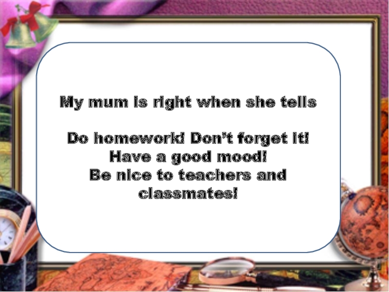 My mum is right when she tellsDo homework! Don’t forget it!Have a good mood!Be nice to teachers