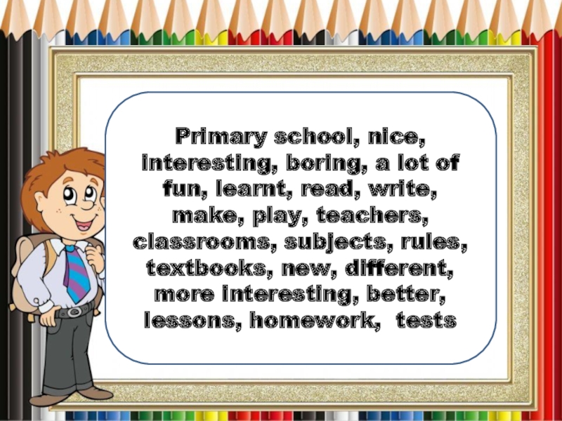 Primary school, nice, interesting, boring, a lot of fun, learnt, read, write, make, play, teachers, classrooms, subjects, rules, textbooks, new, different, more interesting, better, lessons, homework, tests