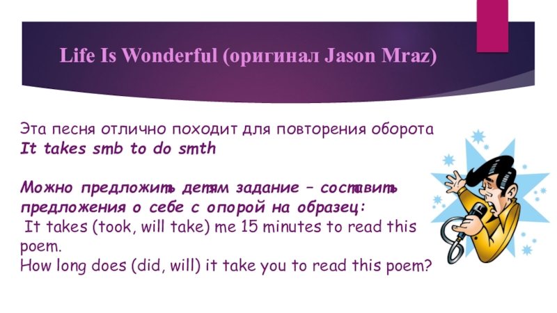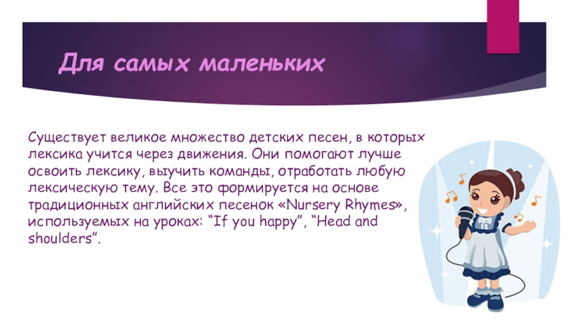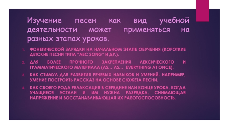 Как стимул для развития речевых навыков и умений. Например, умение построить рассказ на основе сюжета песни.