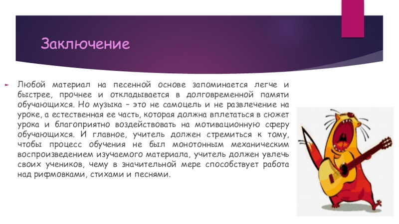 Использование песен на уроках поможет легче и веселее изучать язык, снимет психологическую нагрузку и поддержит интерес к дальнейшей работе.