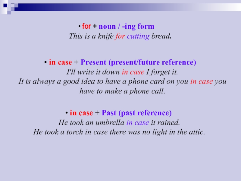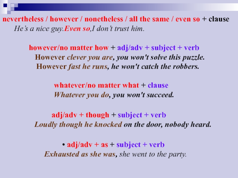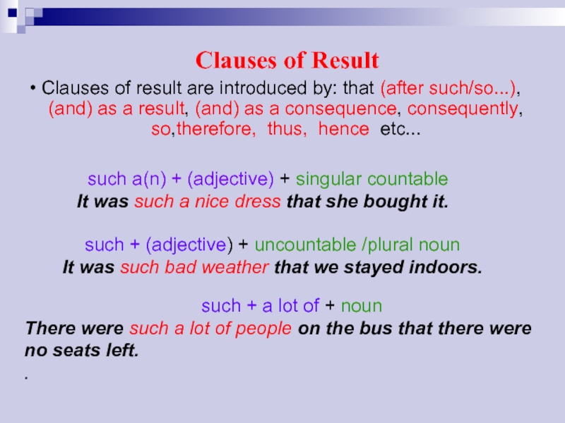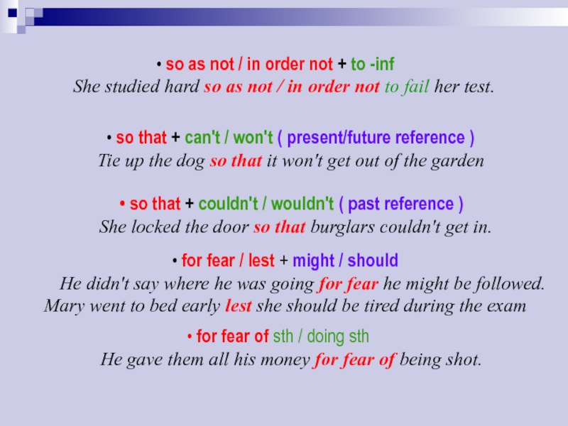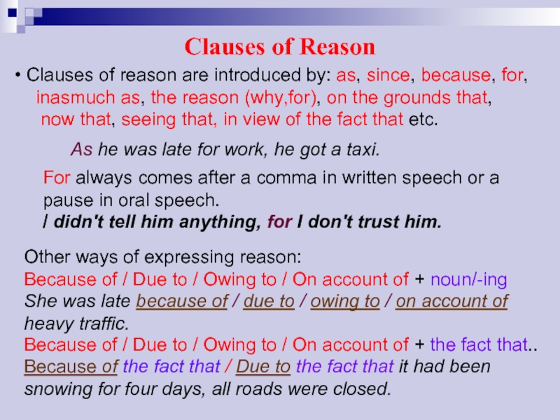 Because of / Due to / Owing to / On account of + noun/-ing She was late because of / due to / owing to / on account of heavy traffic.