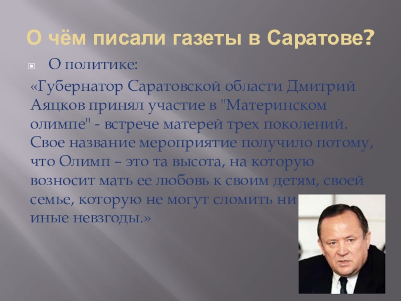 принял участие в "Материнском олимпе" - встрече матерей трех поколений. Свое название мероприятие получило потому, что Олимп – это та высота, на которую возносит мать ее любовь к своим детям, своей семье, которую не могут сломить ни войны, ни иные невзгоды.»