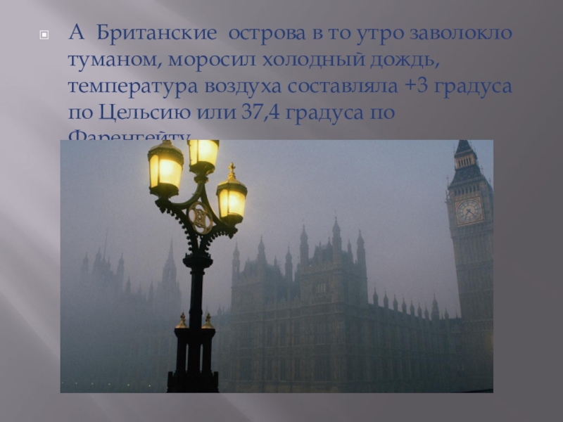 Слайд 4А Британские острова в то утро заволокло туманом, моросил холодный дождь,