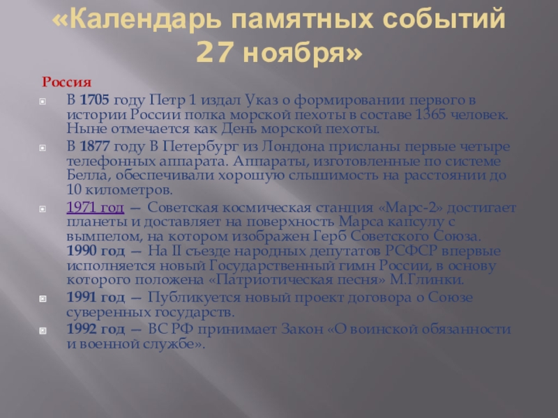 1971 год — Советская космическая станция «Марс-2» достигает планеты и доставляет на поверхность Марса капсулу с вымпелом, на котором изображен Герб Советского Союза.
