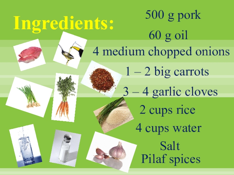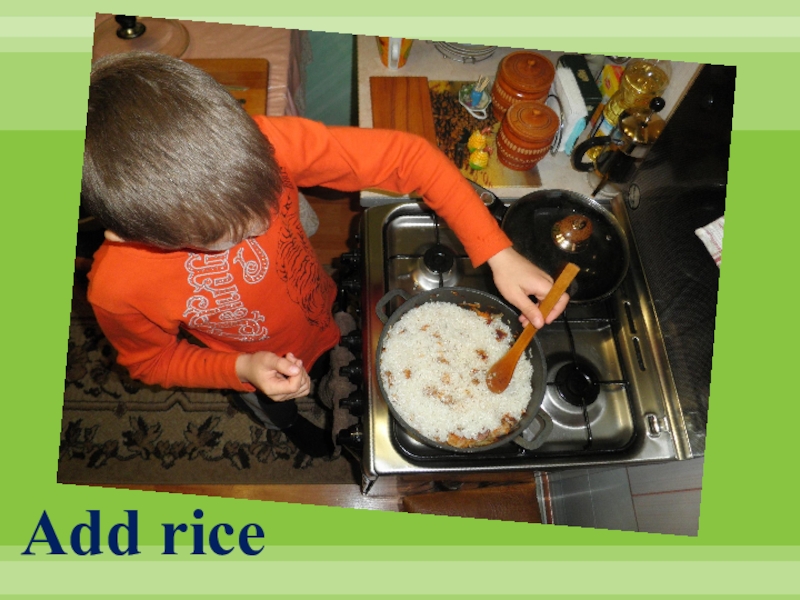 5. Add spices, salt and rice (1 cup rice – 1 ½ cup water).