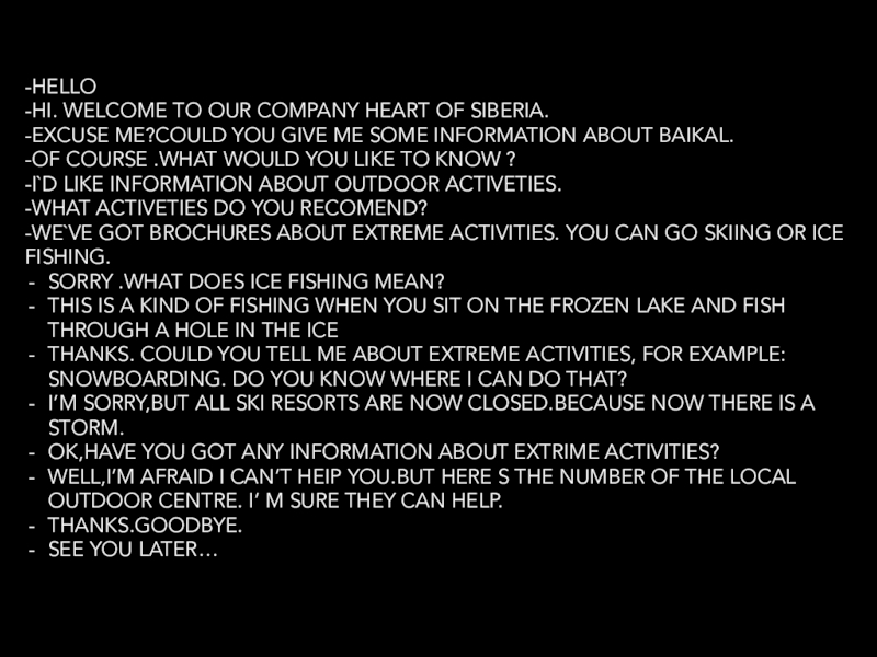 -Hello-Hi. Welcome to our company Heart of Siberia.-Excuse me?Could you give me some information about Baikal.-of course .what would you like to know ?-I`d like information about outdoor activeties.-What activeties Do you recomend?-We`ve got brochures about