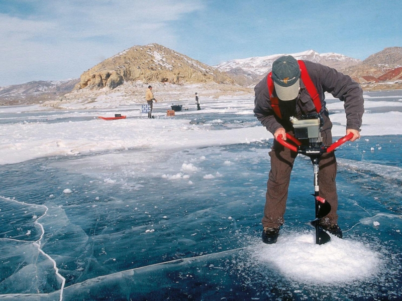 This is a kind of fishing when you sit on the frozen lake and fish through a hole in the ice