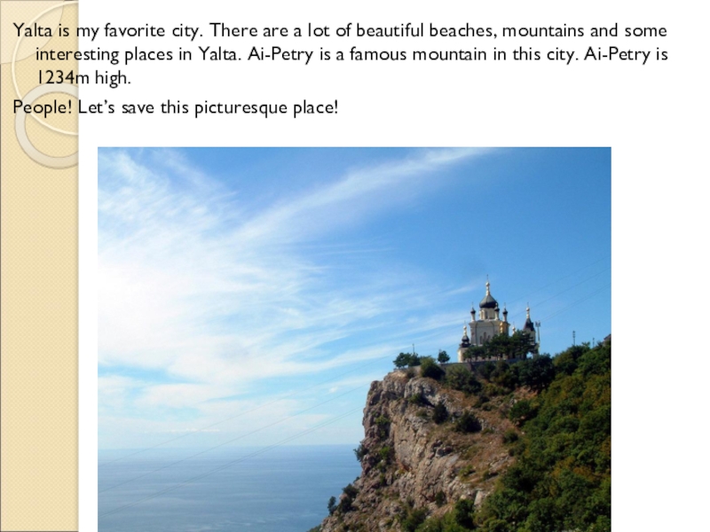 Слайд 13Yalta is my favorite city. There are a lot of beautiful