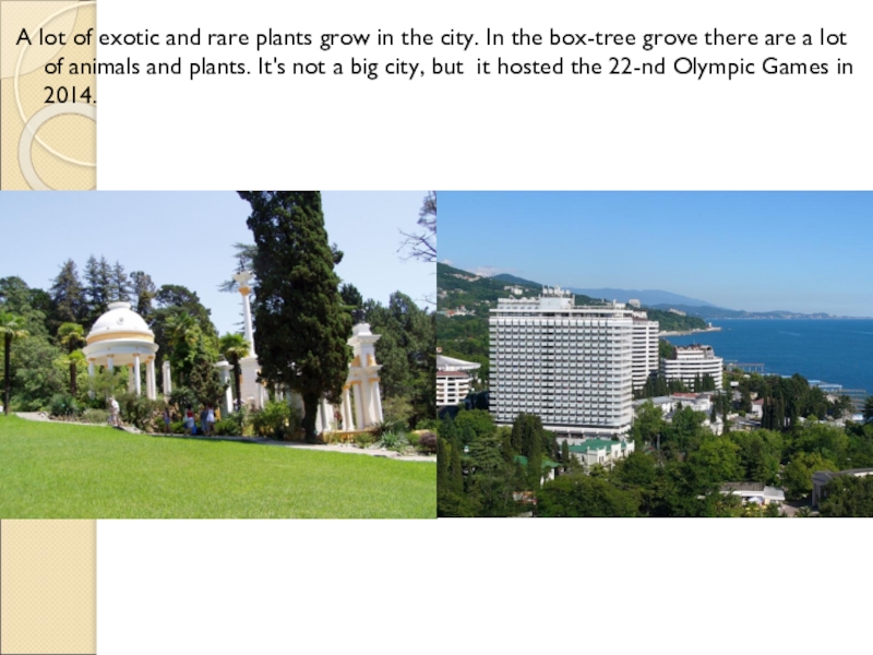In the box-tree grove there are a lot of animals and plants. It's not a big city, but it hosted the 22-nd Olympic Games in 2014.