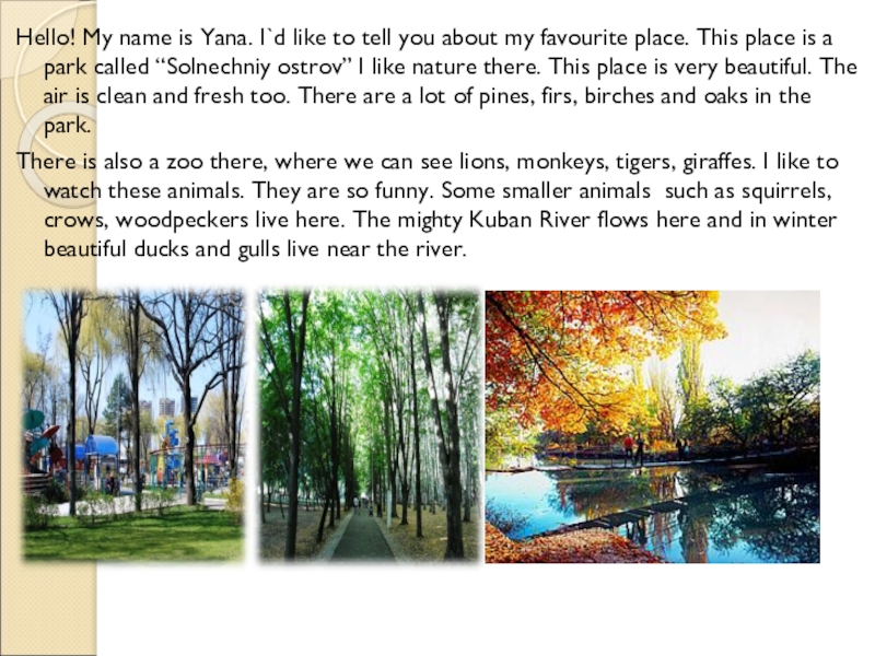 There is also a zoo there, where we can see lions, monkeys, tigers, giraffes. I like to watch these animals. They are so funny. Some smaller animals such as squirrels, crows, woodpeckers live here. The mighty Kuban River flows here and in winter beautiful ducks and gulls live near the river.