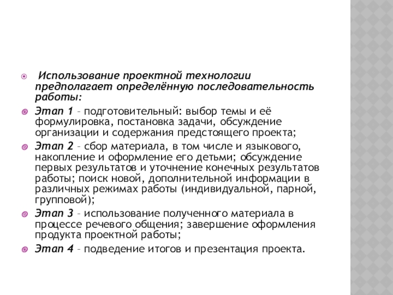 Слайд 6 Использование проектной технологии предполагает определённую последовательность работы: