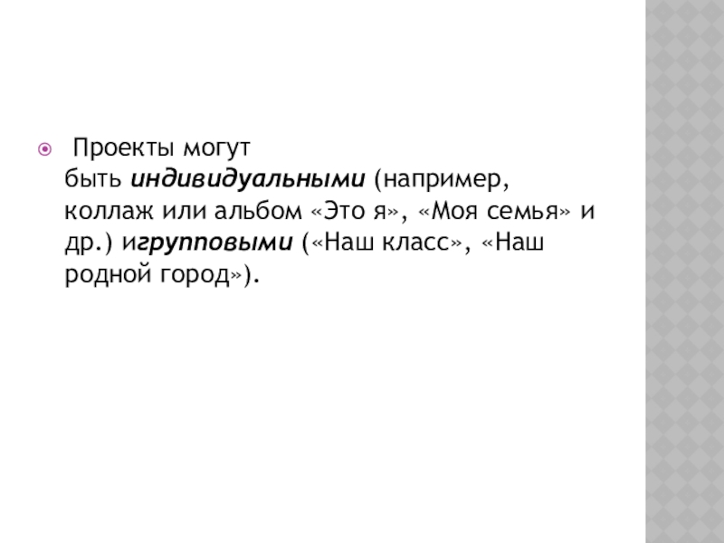 Проекты могут быть индивидуальными (например, коллаж или альбом «Это я», «Моя семья» и др.) игрупповыми («Наш класс», «Наш родной город»).