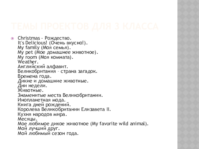 Темы проектов для 3 классаChristmas - Рождество. It's Delicious! (Очень вкусно!). My family (Моя семья). My pet