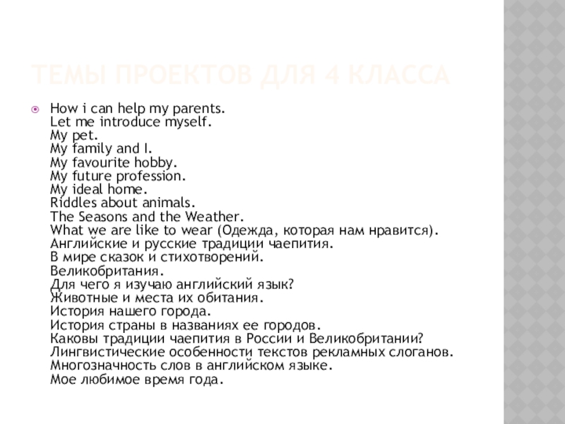 Темы проектов для 4 классаHow i can help my parents. Let me introduce myself. My pet. My