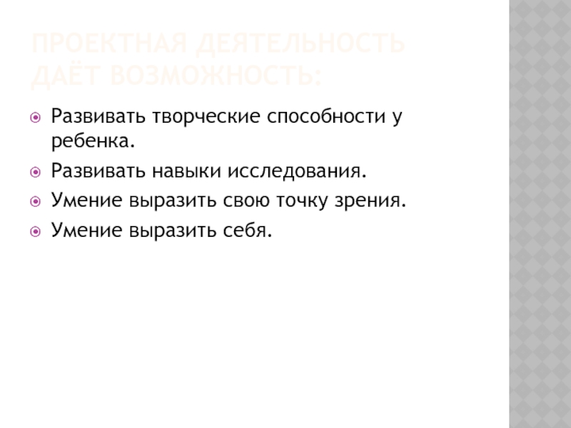 Проектная деятельность даёт возможность:Развивать творческие способности у ребенка.Развивать навыки исследования.Умение выразить свою точку зрения. Умение выразить себя.
