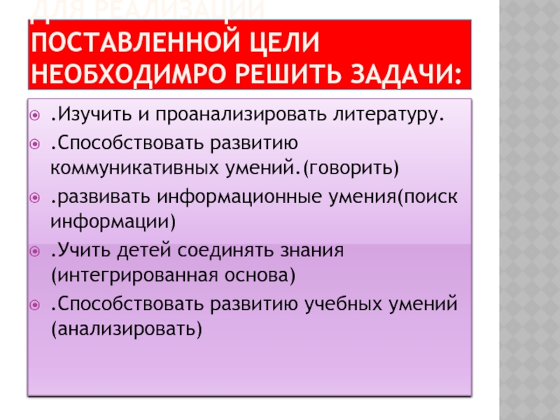 Для реализации поставленной цели необходимро решить задачи:.Изучить и проанализировать литературу..Способствовать развитию коммуникативных умений.(говорить).развивать информационные умения(поиск информации).Учить детей соединять знания(интегрированная основа).Способствовать развитию учебных умений(анализировать)