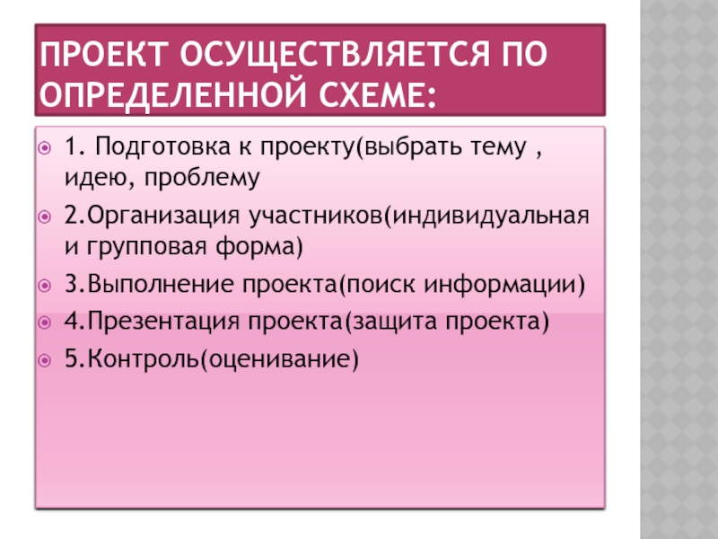 Проект осуществляется по определенной схеме:1. Подготовка к проекту(выбрать тему , идею, проблему2.Организация участников(индивидуальная и групповая форма)3.Выполнение проекта(поиск