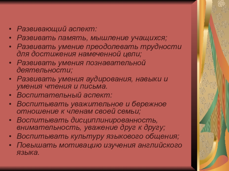 Учить рассказывать о своей семье, используя изученные речевые образцы; представлять свою семью (ознакомить учащихся со структурой This is my family);