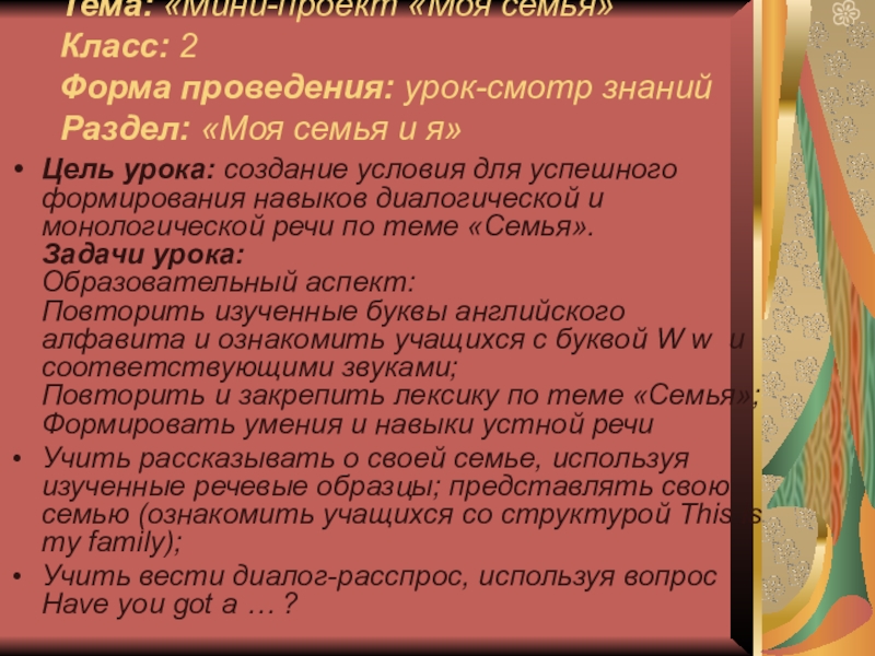Цель урока: создание условия для успешного формирования навыков диалогической и монологической речи по теме «Семья».