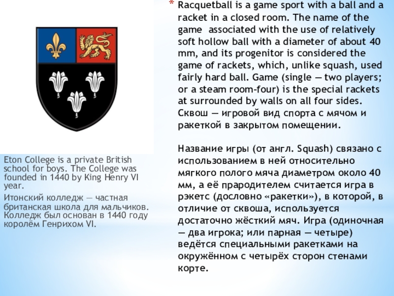Eton College is a private British school for boys. The College was founded in 1440 by King Henry VI year.