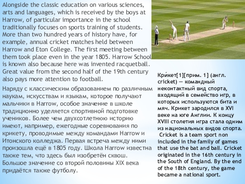 Слайд 9Кри́кет[1][прим. 1] (англ. cricket) — командный неконтактный вид спорта, входящий в