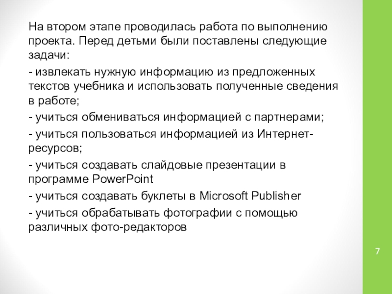 Слайд 7На втором этапе проводилась работа по выполнению проекта. Перед детьми были