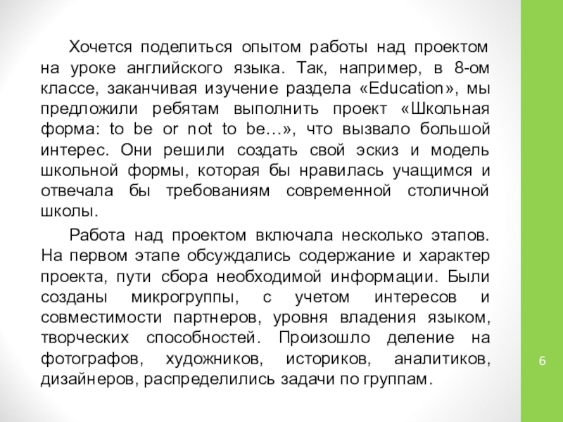 Слайд 6Хочется поделиться опытом работы над проектом на уроке английского языка. Так,