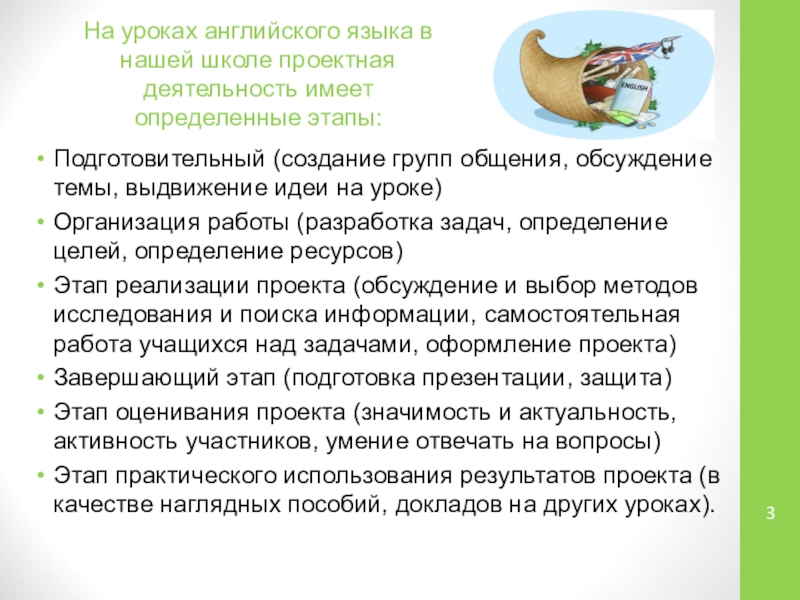 Слайд 3На уроках английского языка в нашей школе проектная деятельность имеет определенные