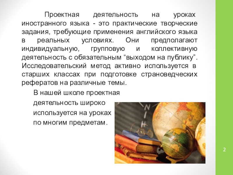 Слайд 2 Проектная деятельность на уроках иностранного языка - это практические творческие