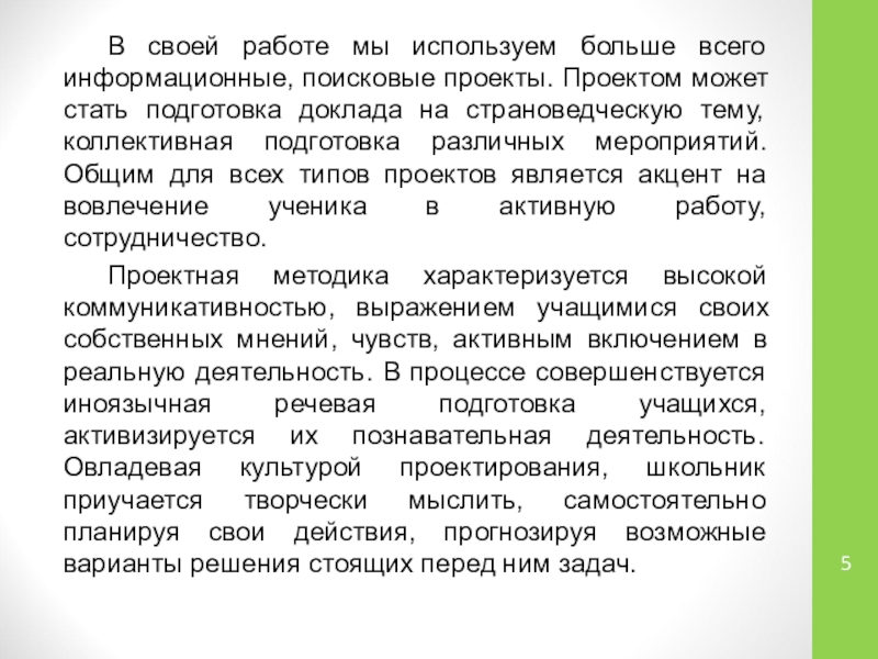 Слайд 5В своей работе мы используем больше всего информационные, поисковые проекты. Проектом