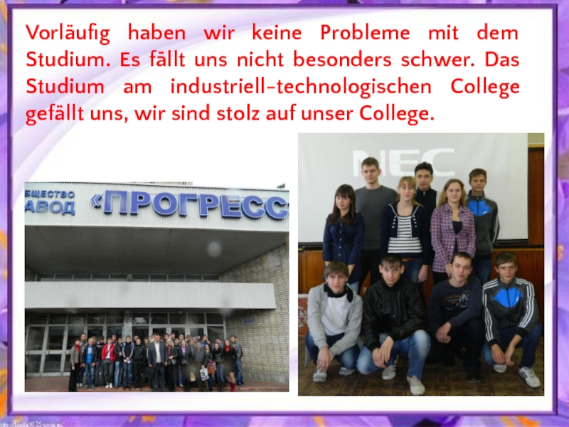 nicht besonders schwer. Das Studium am industriell-technologischen College gefällt uns, wir sind stolz auf unser College.