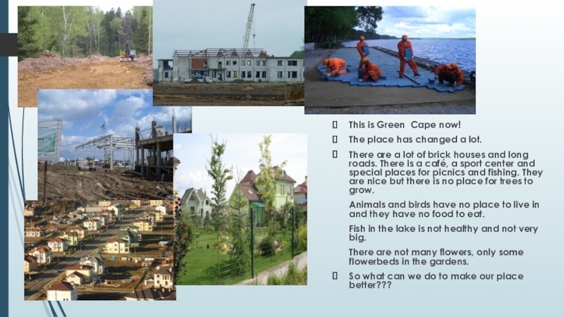 a lot of brick houses and long roads. There is a café, a sport center and special places for picnics and fishing. They are nice but there is no place for trees to grow.