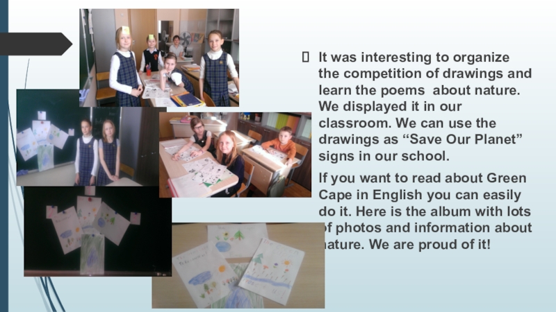 the poems about nature. We displayed it in our classroom. We can use the drawings as “Save Our Planet” signs in our school.