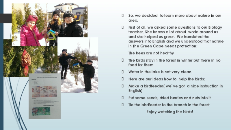 wanted to find out how “green” they are. A study shows that children know very little about nature. We asked 15 pupils of our school. The answers were surprising. One out of 4 doesn`t know what to do with the rubbish after the picnic. Two out of 4 have no idea what kind of food is good for the birds.