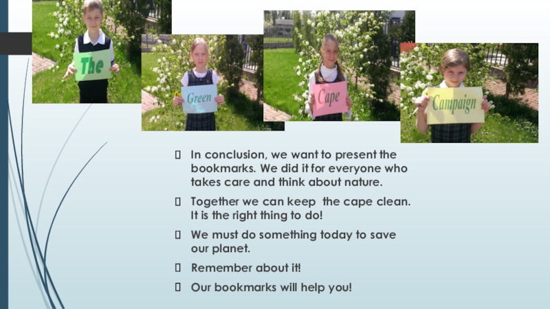 Слайд 9In conclusion, we want to present the bookmarks. We did it