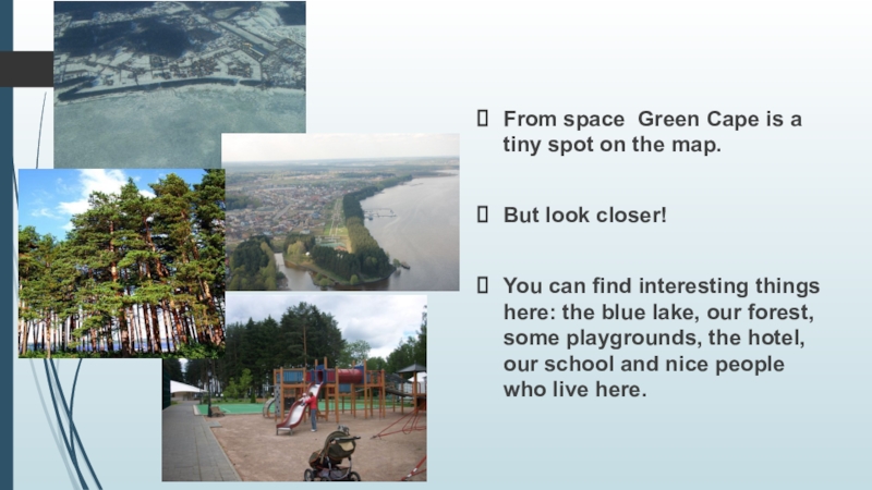 You can find interesting things here: the blue lake, our forest, some playgrounds, the hotel, our school and nice people who live here.