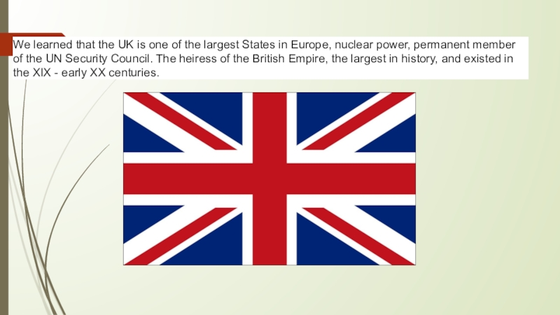 in Europe, nuclear power, permanent member of the UN Security Council. The heiress of the British Empire, the largest in history, and existed in the XIX - early XX centuries.