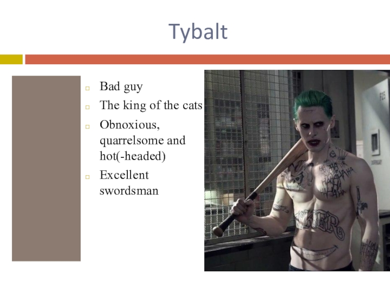 TybaltBad guyThe king of the catsObnoxious, quarrelsome and hot(-headed)Excellent swordsman
