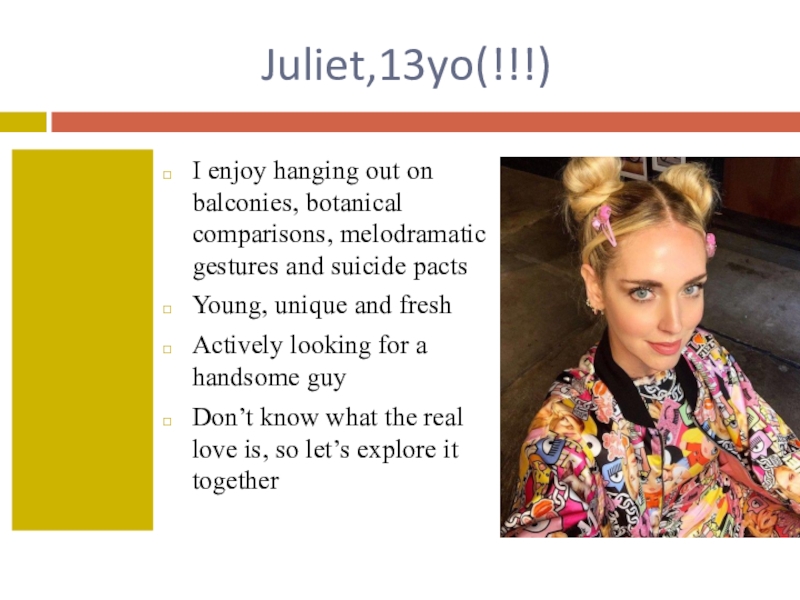 Juliet,13yo(!!!)I enjoy hanging out on balconies, botanical comparisons, melodramatic gestures and suicide pactsYoung, unique and freshActively looking