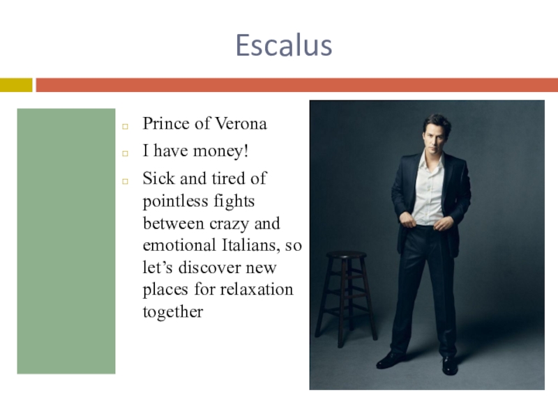EscalusPrince of VeronaI have money!Sick and tired of pointless fights between crazy and emotional Italians, so let’s
