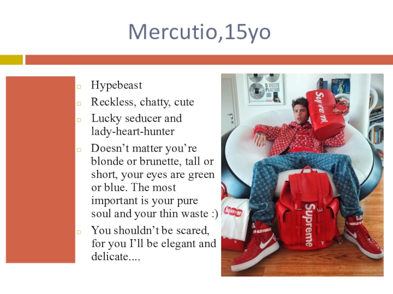 Mercutio,15yoHypebeast Reckless, chatty, cuteLucky seducer and lady-heart-hunterDoesn’t matter you’re blonde or brunette, tall or short, your eyes are