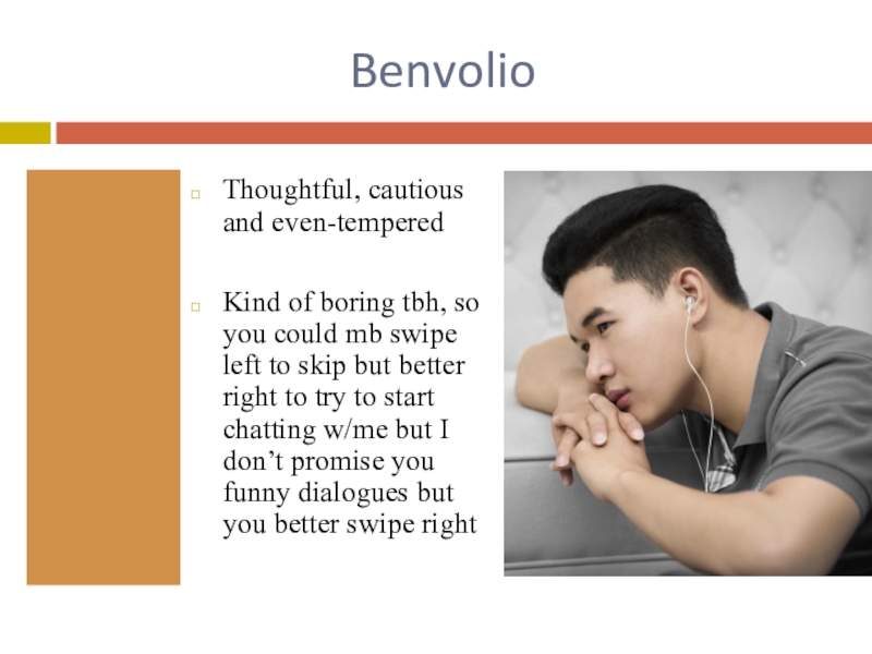 BenvolioThoughtful, cautious and even-temperedKind of boring tbh, so you could mb swipe left to skip but better
