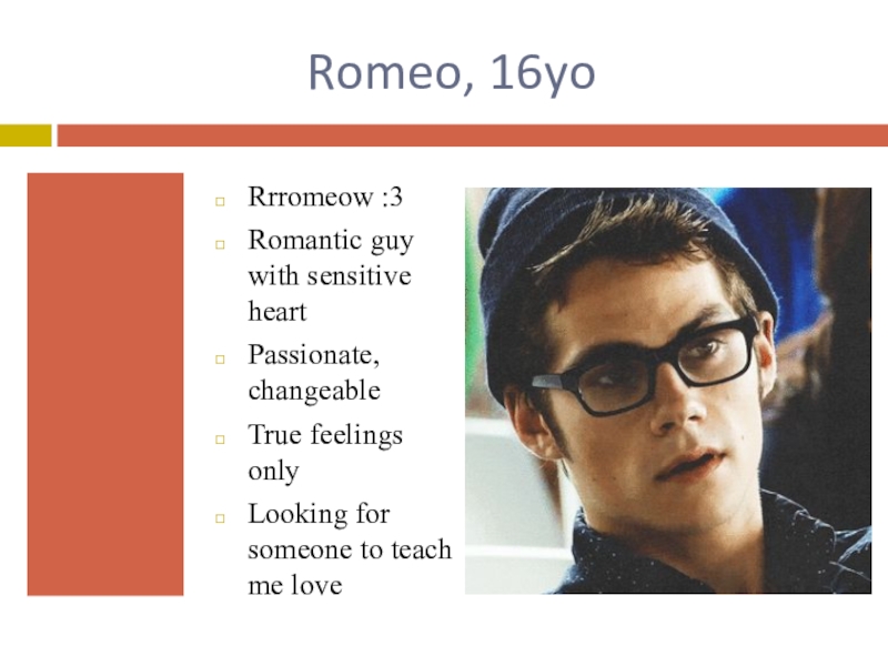 Romeo, 16yoRrromeow :3Romantic guy with sensitive heartPassionate, changeableTrue feelings onlyLooking for someone to teach me love