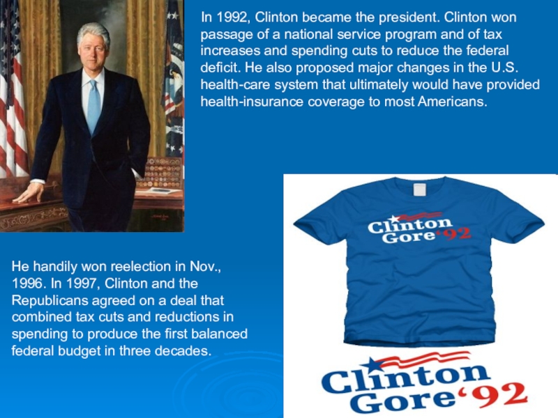 He handily won reelection in Nov., 1996. In 1997, Clinton and the Republicans agreed on a deal that combined tax cuts and reductions in spending to produce the first balanced federal budget in three decades.