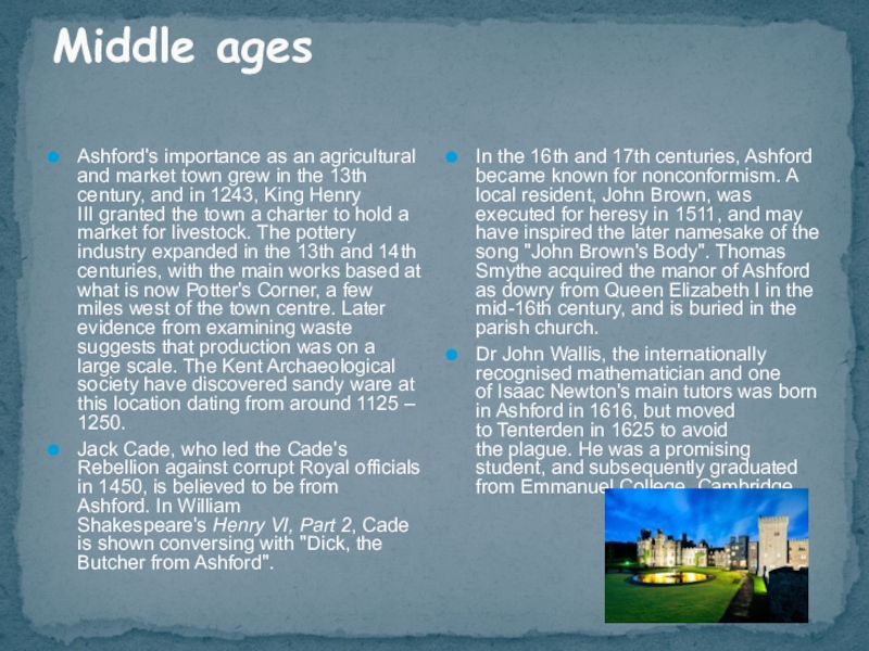 In the 16th and 17th centuries, Ashford became known for nonconformism. A local resident, John Brown, was executed for heresy in 1511, and may have inspired the later namesake of the song "John Brown's Body". Thomas Smythe acquired the manor of Ashford as dowry from Queen Elizabeth I in the mid-16th century, and is buried in the parish church.